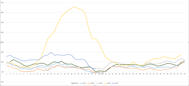 of the year (orange circle) and the lower peak than previous years. After the trough, it began it’s plateau in